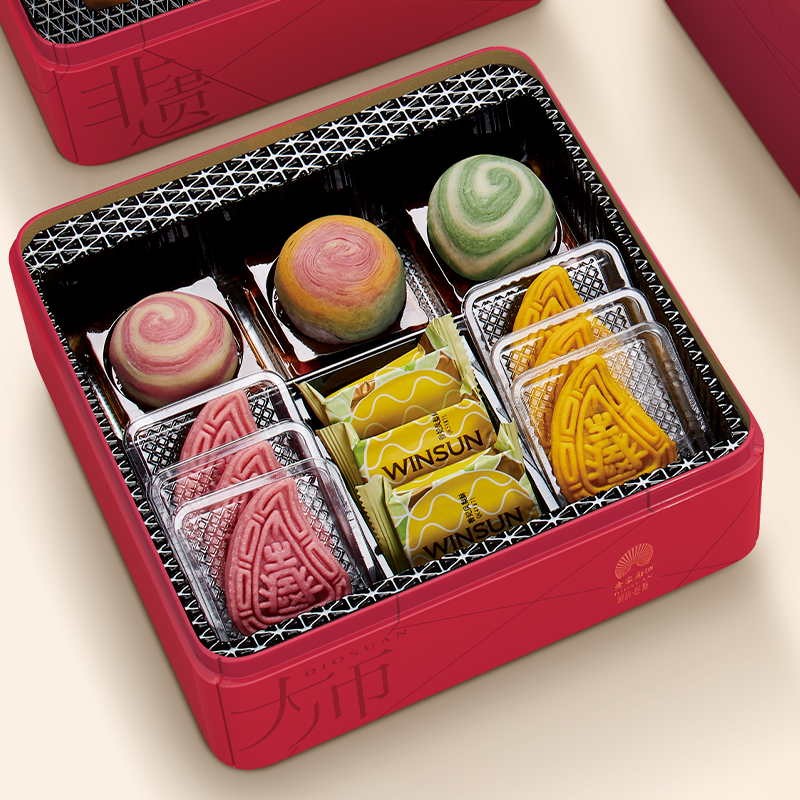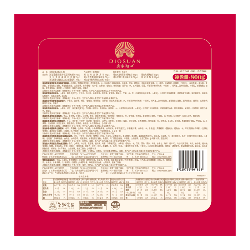 【編 碼】 YBT2319 【條形碼】 6925755561863 【尺 寸】 25x25x15cm 【凈含量】 800g 【規(guī) 格】 800gx6盒/箱 【內(nèi)容物】 80g潮汕雪媚娘蛋黃烏豆沙酥皮餅x1+80g潮汕雙烹酥皮餅x1+80g潮汕單叢鴨屎香茶酥皮餅x1+80g潮汕黃皮酥皮餅x1+30g潮汕報(bào)春紅殼桃糕點(diǎn)(山楂蔓越莓)x3+30g潮汕金葉黃殼桃糕點(diǎn)(肉松)x3+70g潮汕青梅桑椹彩虹酥x1+70g潮汕百香果洛神花彩虹酥x1+70g潮汕檸檬卡曼橘彩虹酥x1+30g香妃鳳梨酥x3